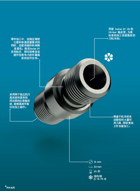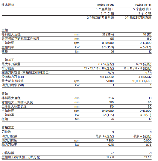 Swiss DT 系列瑞士型車床專業(yè)設(shè)計(jì)滿足典型長(zhǎng) 短車削工件的各種要求。該系列機(jī)床簡(jiǎn)單易 用,加工直徑達(dá) 13 和 25.4 mm,可顯著提高生 產(chǎn)效率。Swiss DT 系列采用先進(jìn)的技術(shù)和高效的五軸運(yùn)動(dòng)結(jié)構(gòu),是所有車削和銑削加工的理想之選。