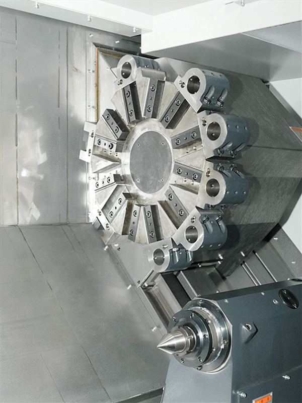 高剛性床身和主軸、大跨距硬軌,配合12工位液壓刀塔,保證了機(jī)床具有高效率、重切削特點。